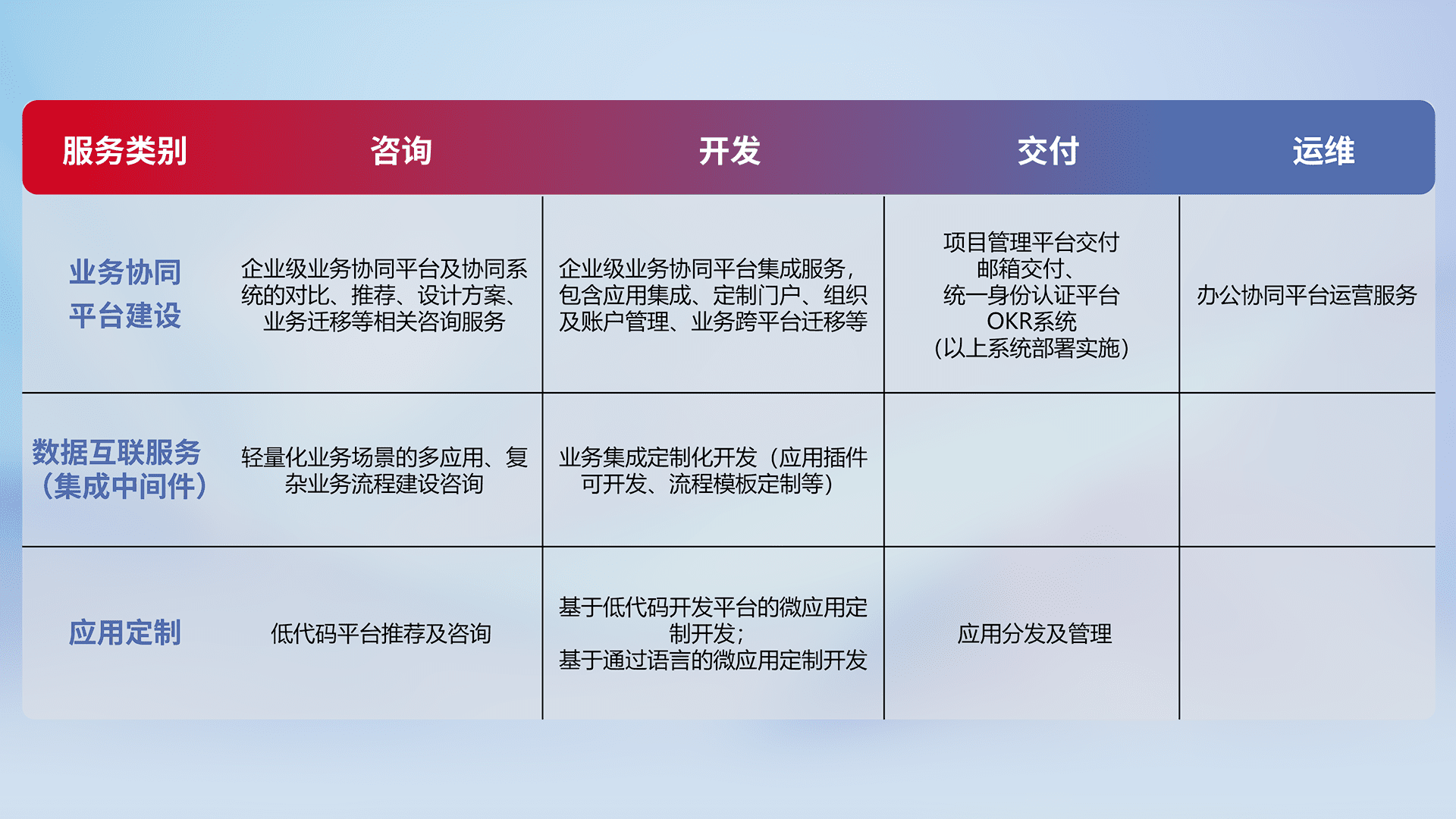 针对钉钉、、、、企微、、、IDaas等平台级产品提供产品的规划、、、方案、、、、交付、、、定制化开发等服务,,,,实现如统一协同办公、、、智能客户服务、、、混合会议管理、、、智能数据查询、、、、等业务场景,,,,实现数字化转型。。。